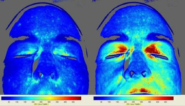Enhanced facial blood flow (right image) observed after 20 minutes of grounding, captured using a Speckle Contrast Laser Imager. In the image, dark blue indicates minimal circulation, while dark red represents peak circulation levels.
